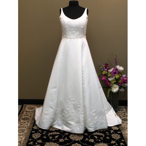 This bridal satin, tank-style gown features beaded floral appliques at the waist, along the hemline, and on the semi-cathedral train. A full skirt falls from the box pleats at the back waistline.
