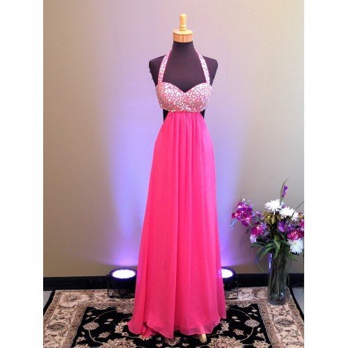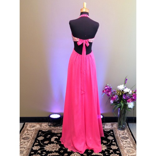 beaded, halter-style, chiffon gown features a low, tie bra back.