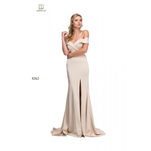 Close Size ChartThis elegant off-the-shoulder gown features a sweetheart neckline and side leg slit.