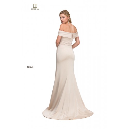 This elegant off-the-shoulder gown features a sweetheart neckline and side leg slit.