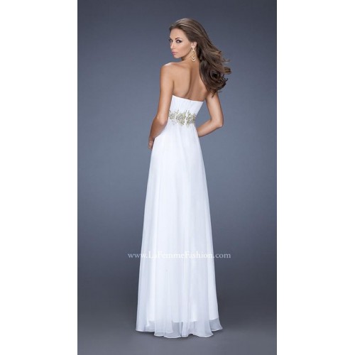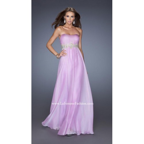 Elegant chiffon gown with a gathered bodice and skirt. The waistband is adorned with embroidered lace and iridescent jeweled appliques. Back zipper closure.