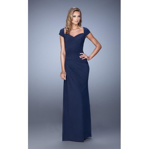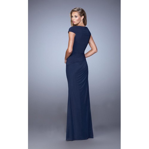 off-the-shoulder neckline, short sleeves and totally ruched body. This fabulous crimson sheath is perfect for a