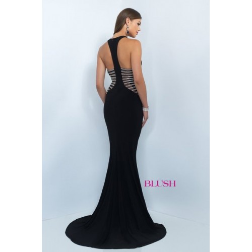Sleek and stunning gown in black with plunging neckline, racer back, and plenty of visual interest along the bodice.